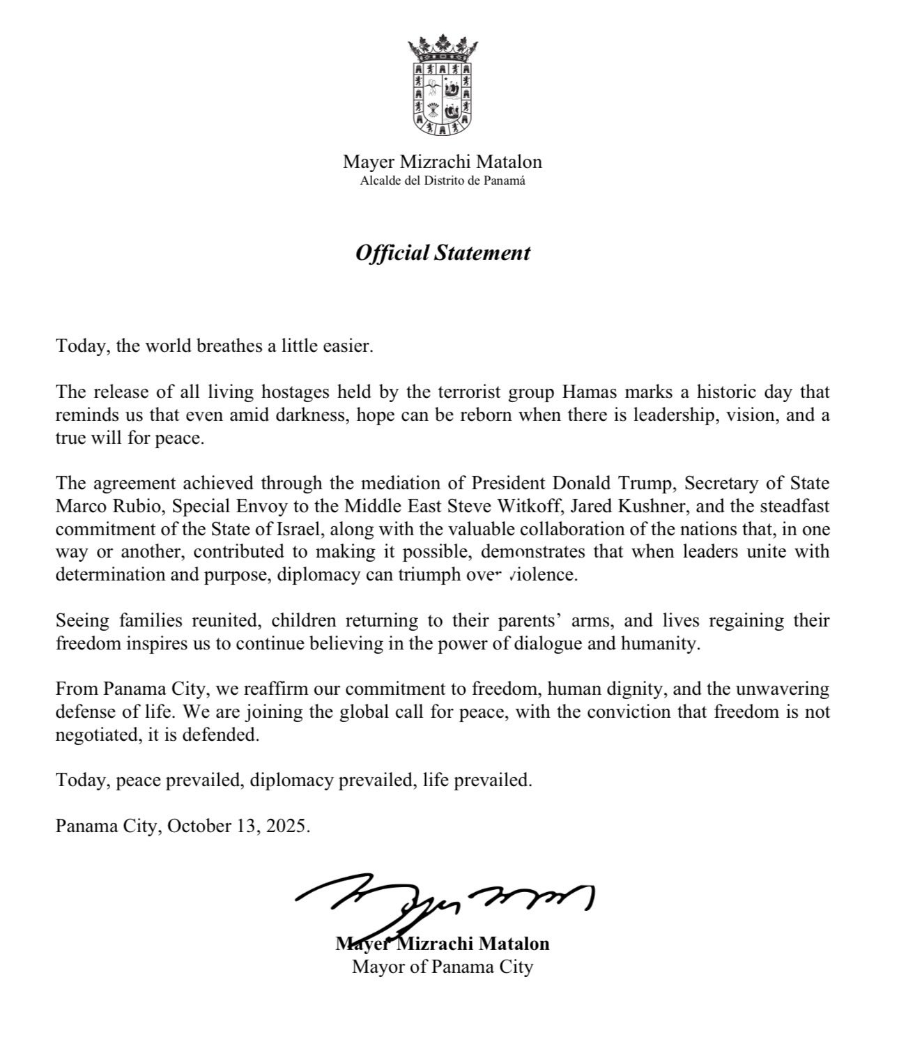 In the self-explanatory note. We clearly see how the mayor sees himself in favor of Israel and also violates Article 10 of the right of neutrality that Panama must take.
